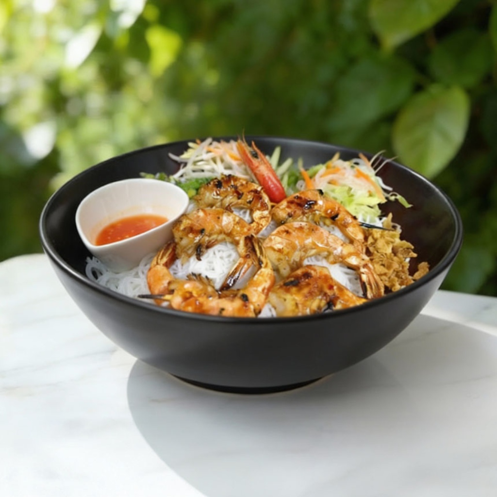 Grilled marinated prawns over vermicelli noodles, served with fresh vegetables, roasted peanuts, fried shallots, and homemade fish sauce.