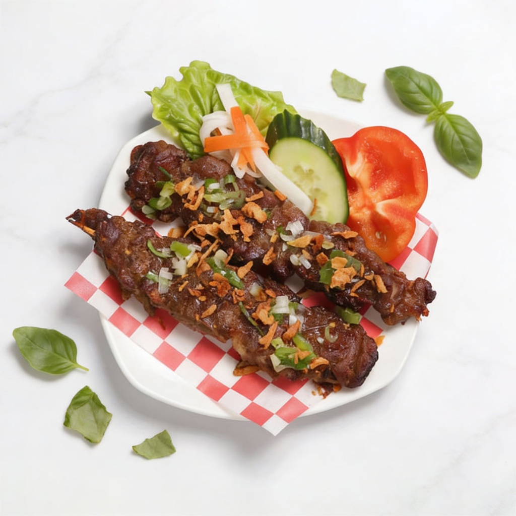 Grilled lemongrass chicken and pork skewer, served on vermicelli rice noodles.