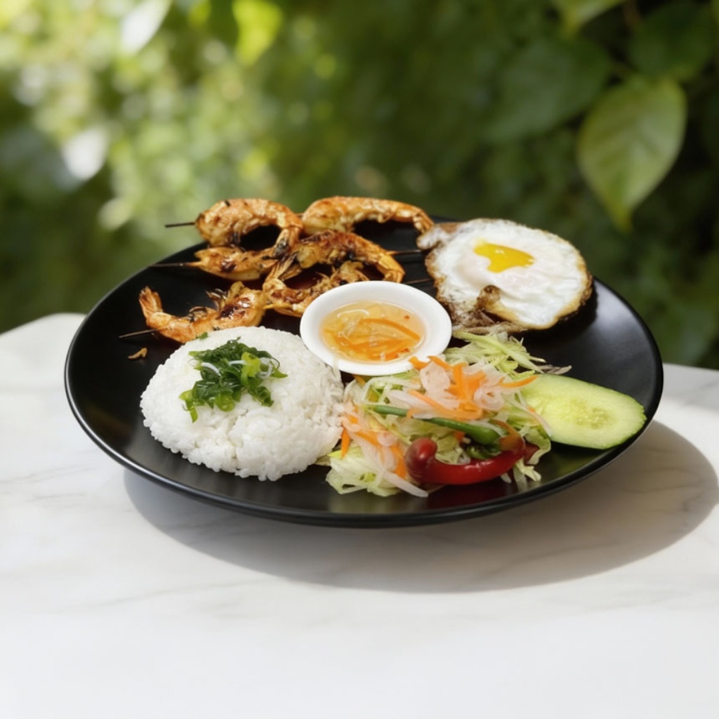 Grilled marinated prawns and egg over rice, typically accompanied by lettuce, tomatoes, cucumbers, and pickled carrots/daikon. Served with in-house fish sauce.