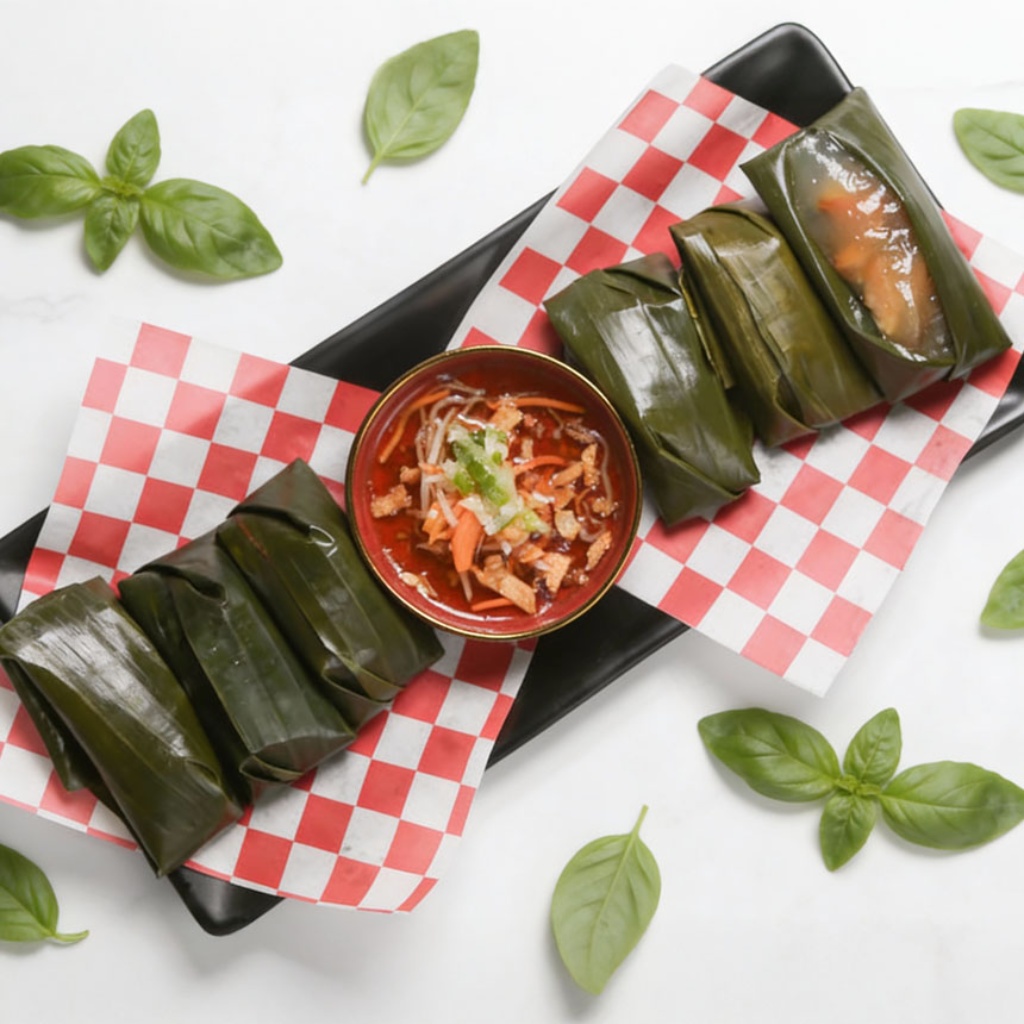 Clear, chewy tapioca dumplings filled with shrimp and pork wrapped in banana leaf. Served with chili fish sauce on the side.