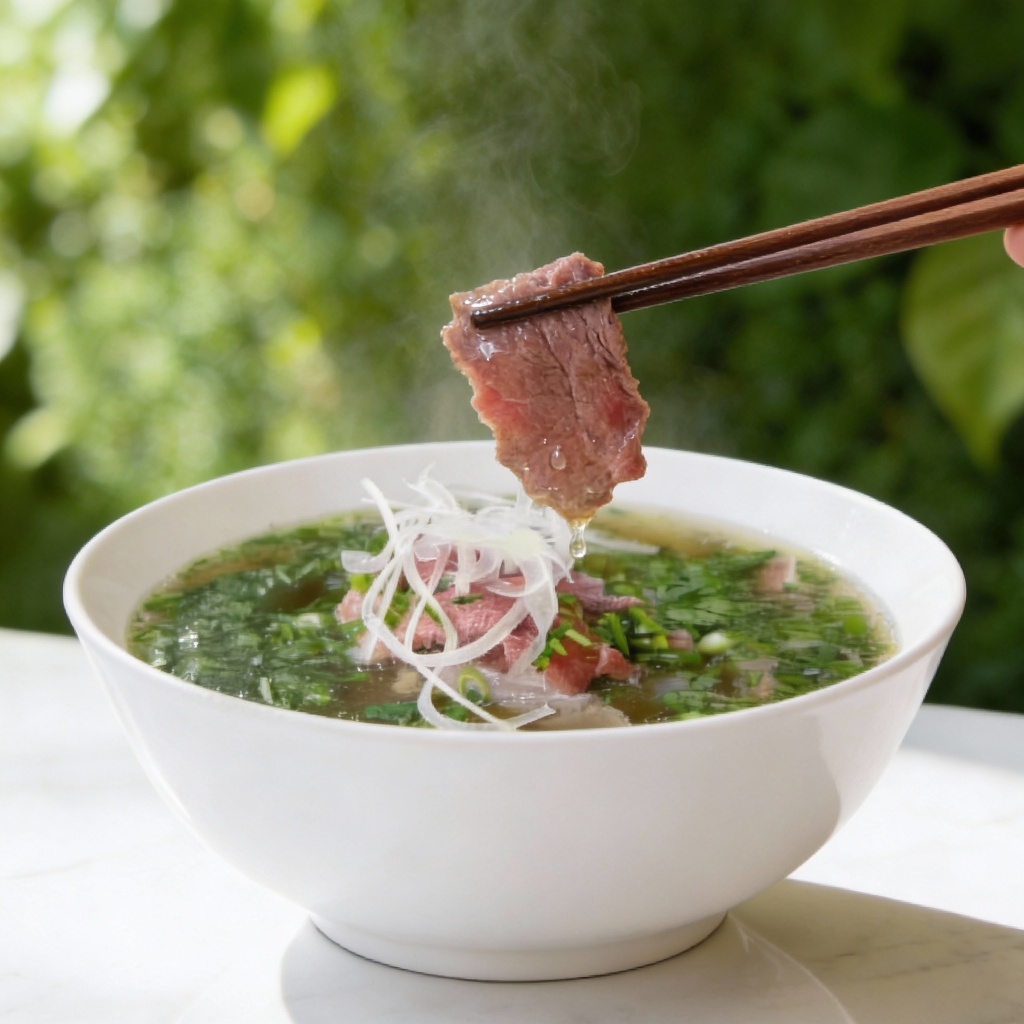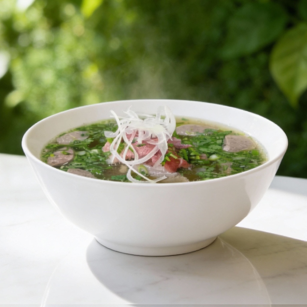 Rice noodles in a rich beef broth, topped with thinly sliced rare steak, white onions, green onions, and cilantro.