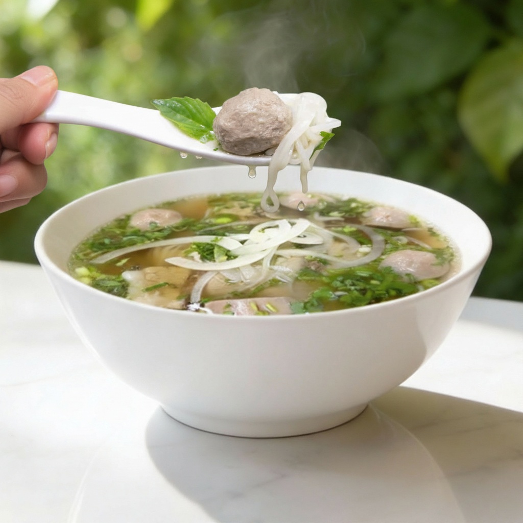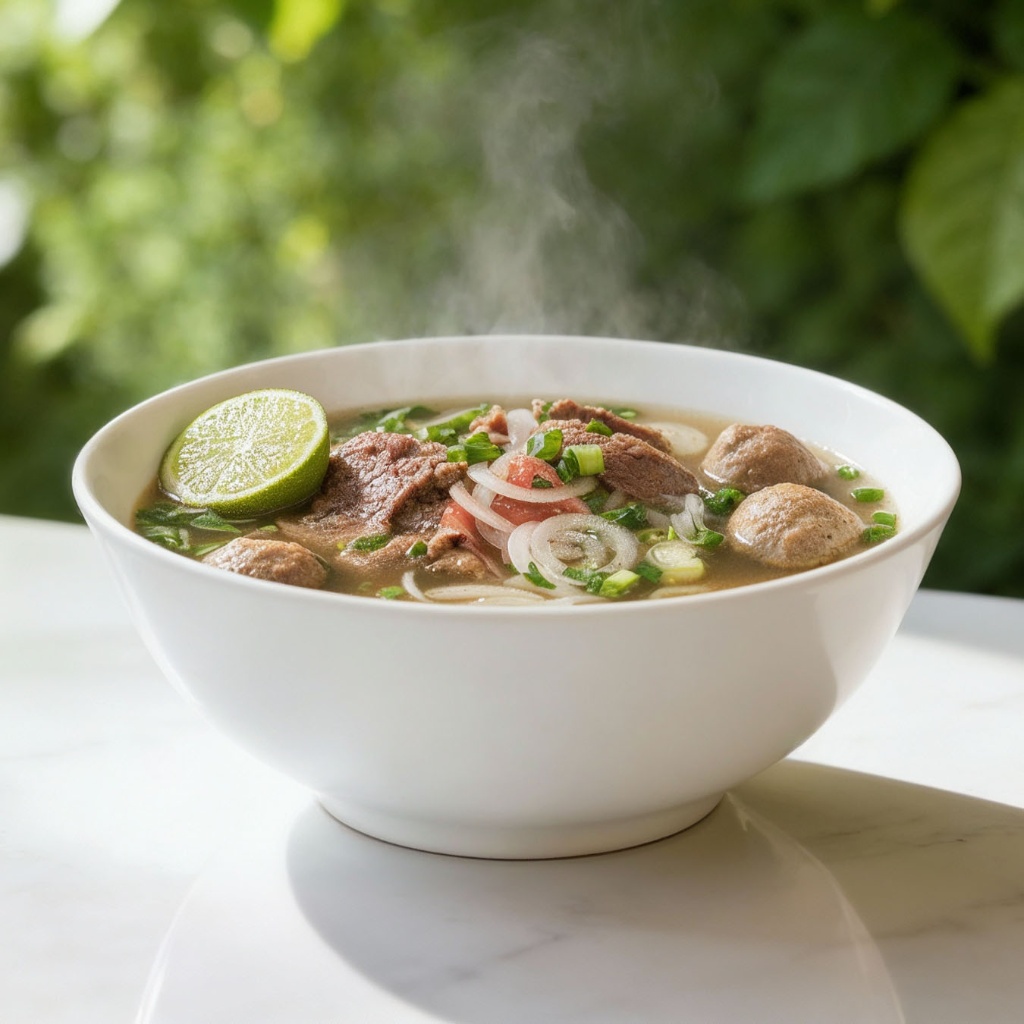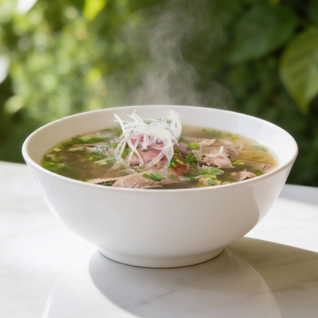Rice noodle soup with tender brisket slices, beef broth, white onions, green onions, and cilantro.