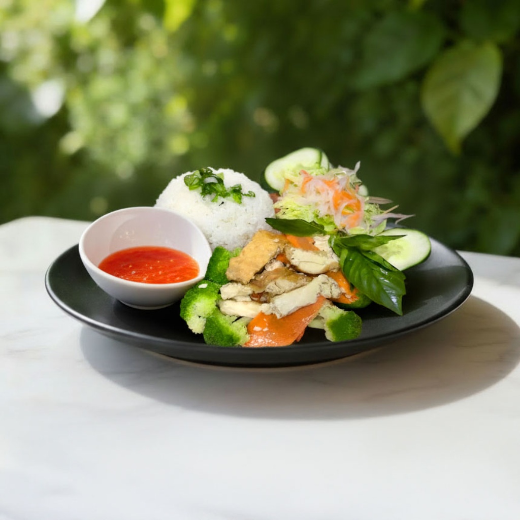 Stir-fried tofu with mixed vegetables served over steamed rice (đậu phụ và rau).