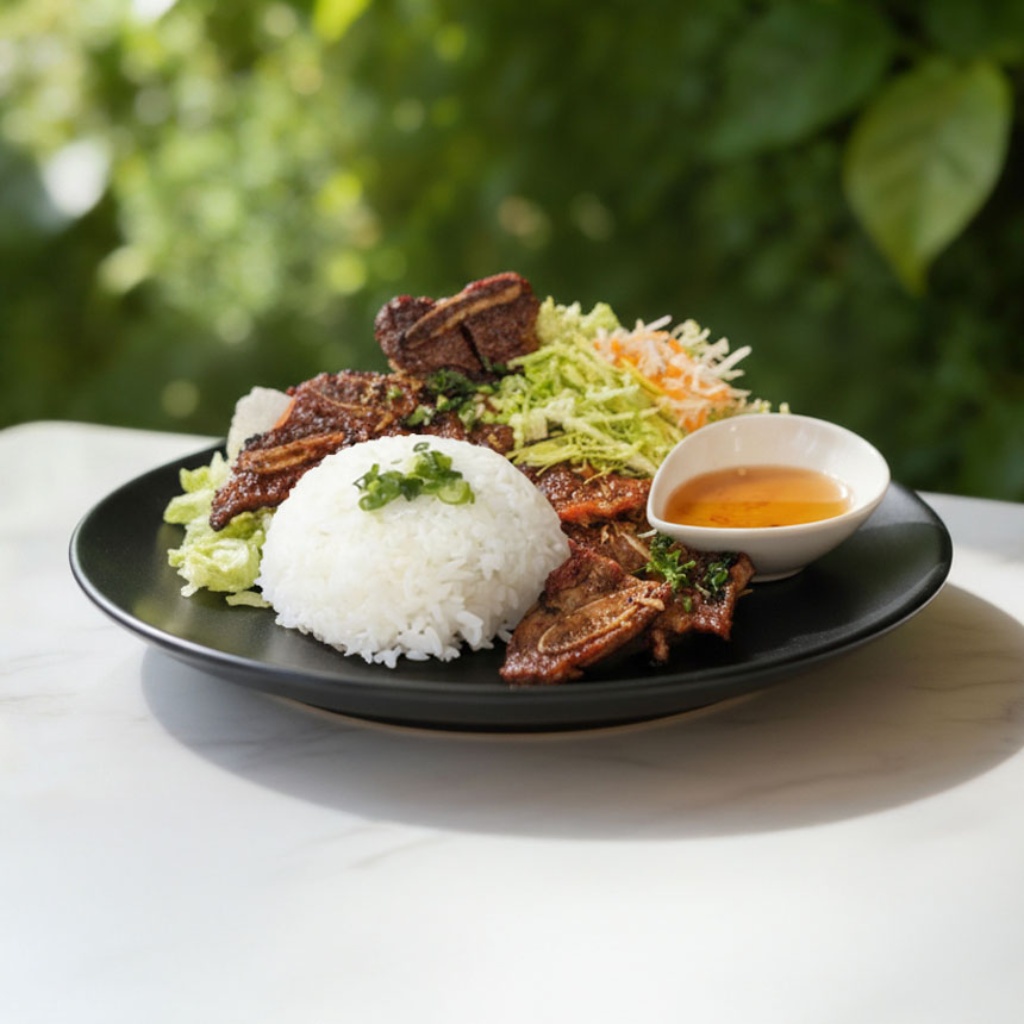 Grilled beef short ribs served with jasmine rice, lettuce, cucumber, and pickled carrots and daikon, topped with green onions. Typically includes in-house fish sauce.