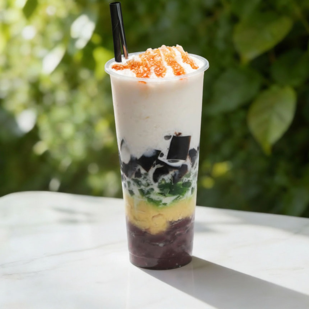 A refreshing Vietnamese treat layered with sweet red beans, mung beans, green jelly, grass jelly, and crystal pearls, all topped with a creamy coconut slush. Served chilled for a perfect balance of sweetness, texture, and tropical flavor.