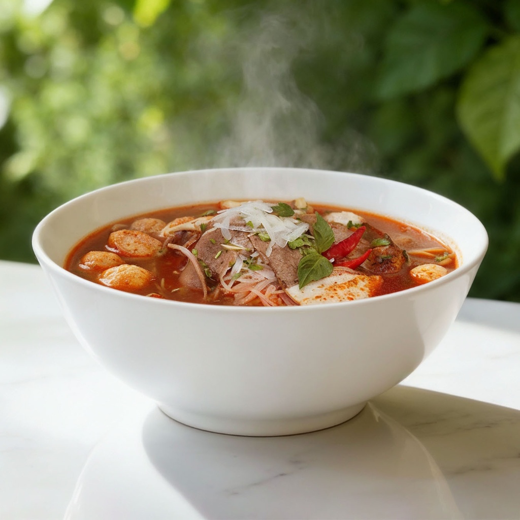 Spicy beef noodle soup with beef shank, brisket, pork ham, and pork blood in a lemongrass-infused broth.