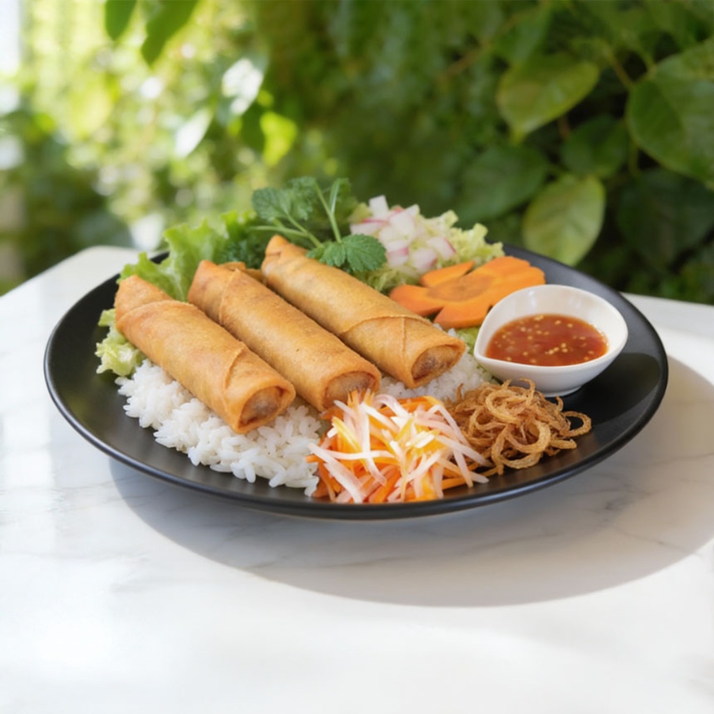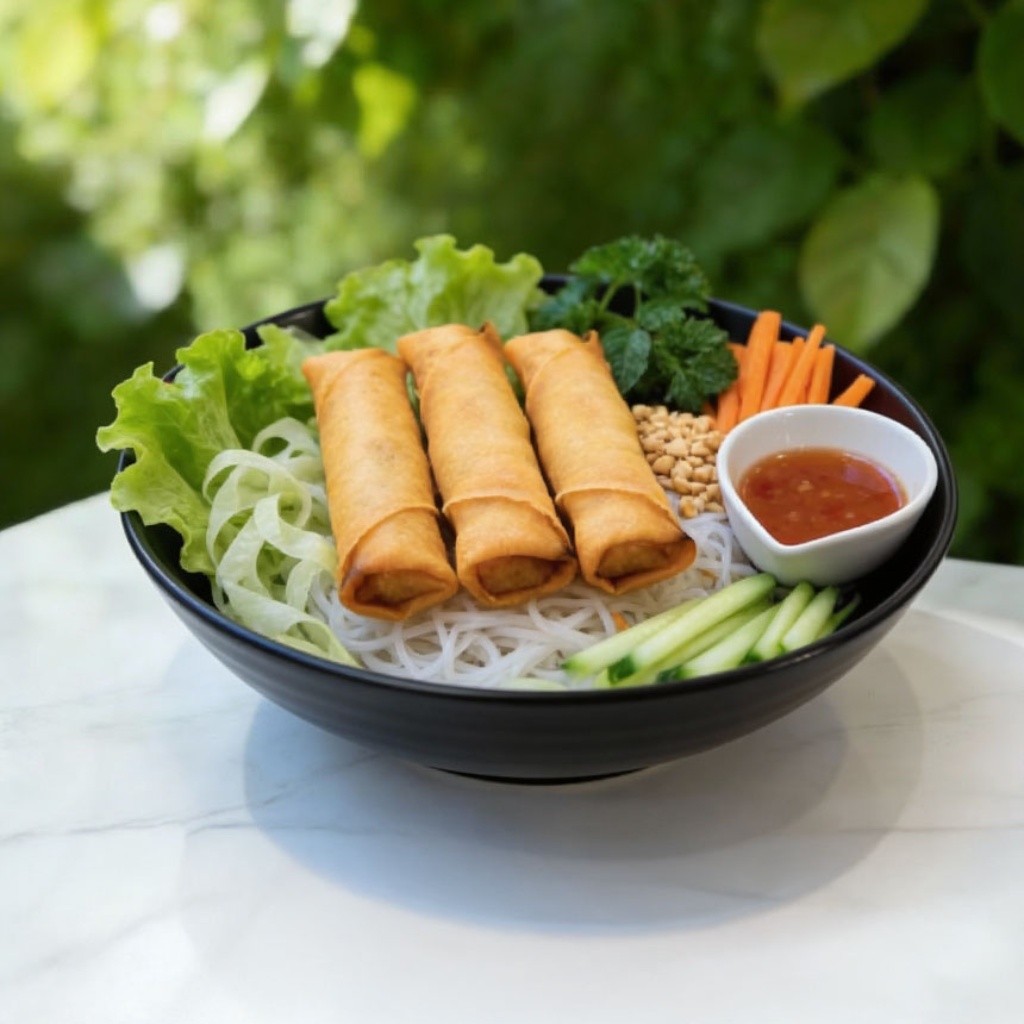 Spring rolls with meat or vegetables, served on rice vermicelli, typically accompanied by lettuce, cucumber, pickled carrots, mint, and topped with crushed peanuts and fish sauce.
