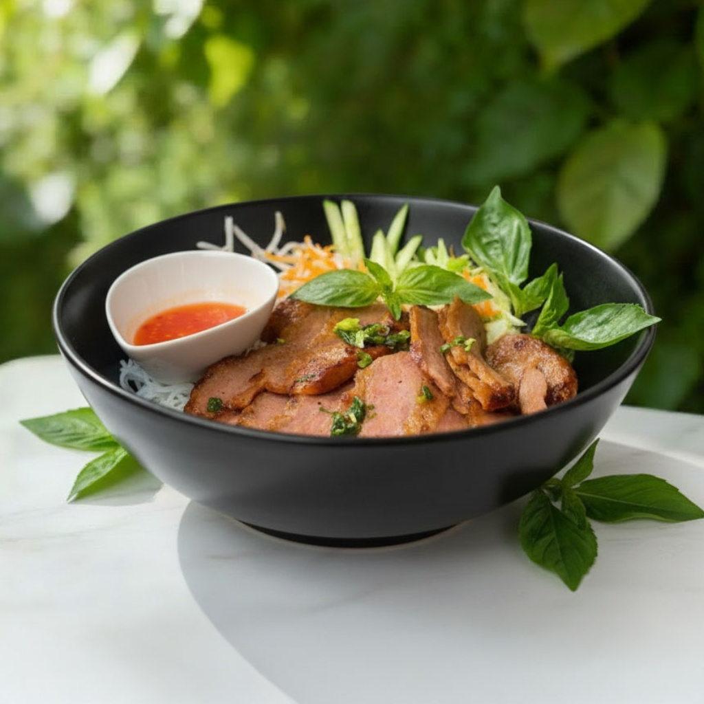 Grilled minced pork patty, vermicelli, fresh herbs, lettuce, cucumber, pickled carrots, fried onions, peanuts, and fish sauce.