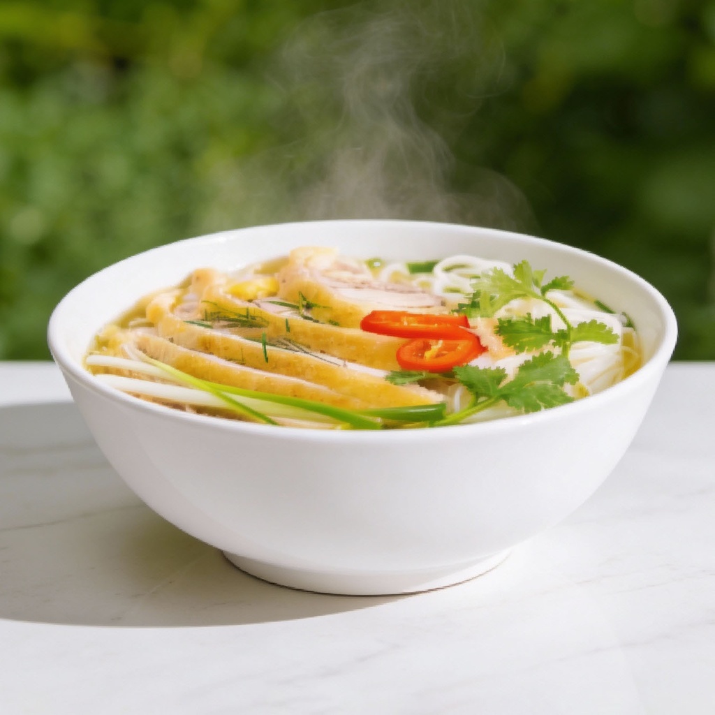 Slices of chicken, rice noodles, green onions, and cilantro in chicken broth.