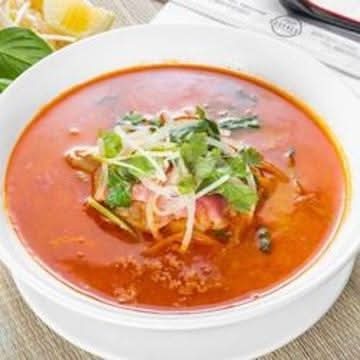 PG vegetarian noodle soup served with rice noodles assorted vegetables, tofu in a all vegetable broth.