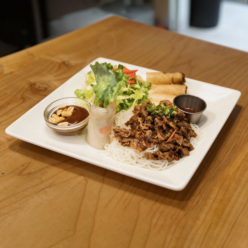 Combo B comes with Grilled Pork (6oz), Spring Rolls (2), Regular Salad Roll (1) (contains Peanuts) and Salad